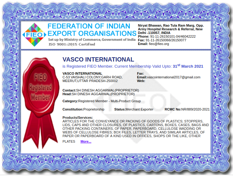 VASCO INTERNATIONAL is a registered member of the Federation of Indian Export Organization (FIEO). At Vasco, we are proud to be associated with the world top Insulation company by consistently supplying quality products.